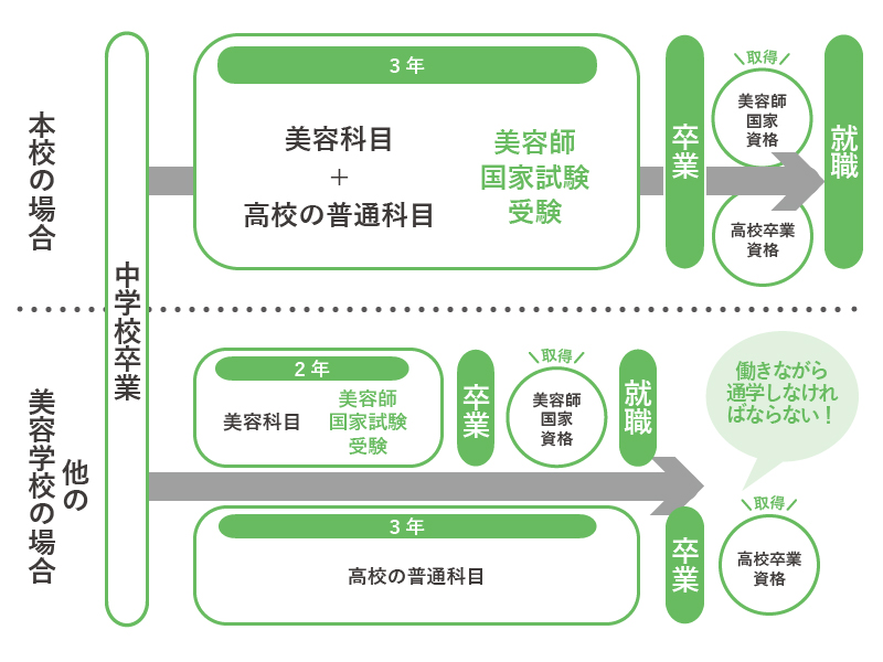 本コースは八洲学園高等学校の技能連携校で、高校の普通科と美容の専門科目の習得を同時に進められます。