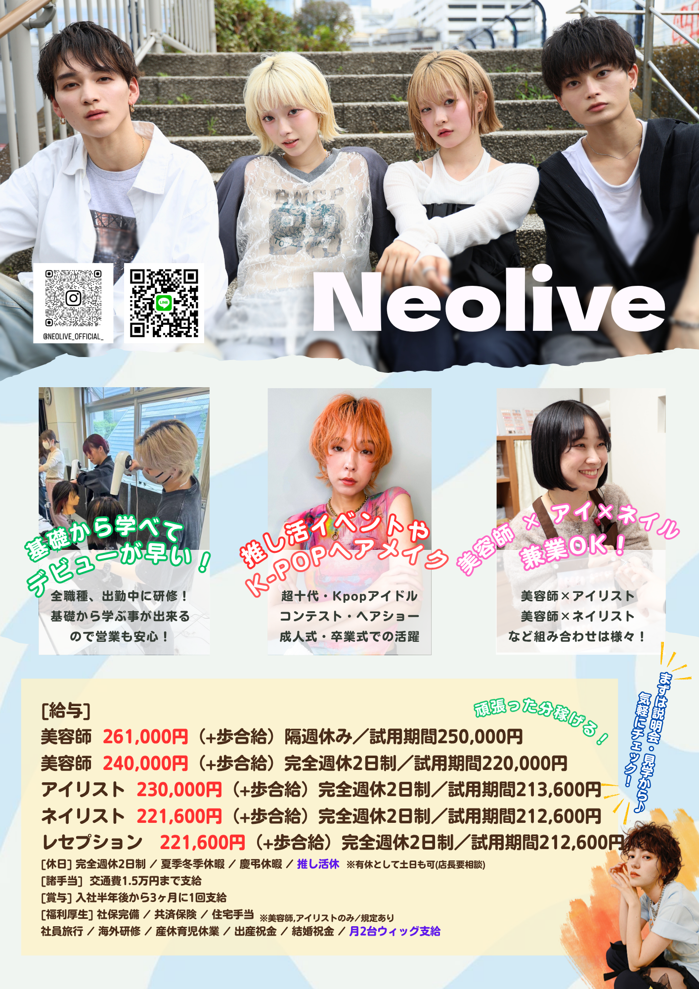 | 休日 | ・完全週休二日制 ・隔週休み※美容師のみ選択可 ・夏季冬季休暇 ・年次有給休暇(入社半年後から10日間付与) |